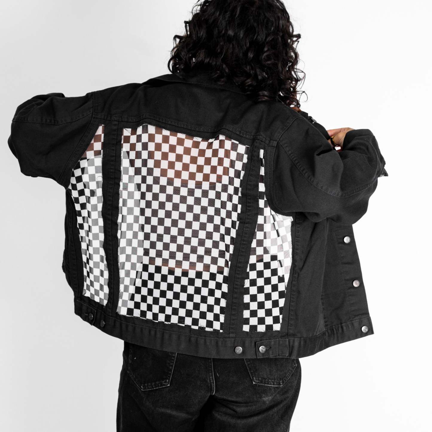 Black & White Checkerboard Mesh. Blue, Black, or Grey Denim.