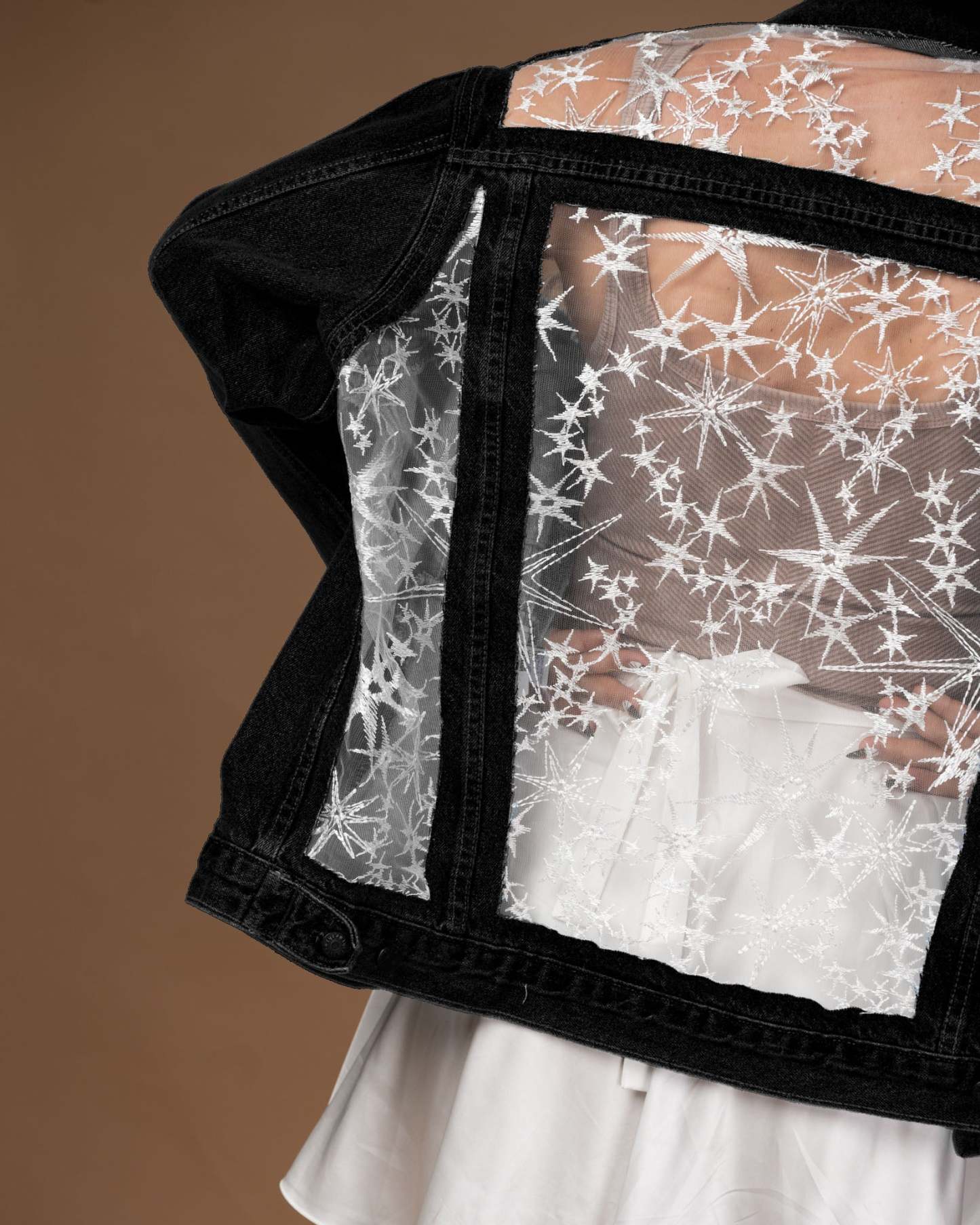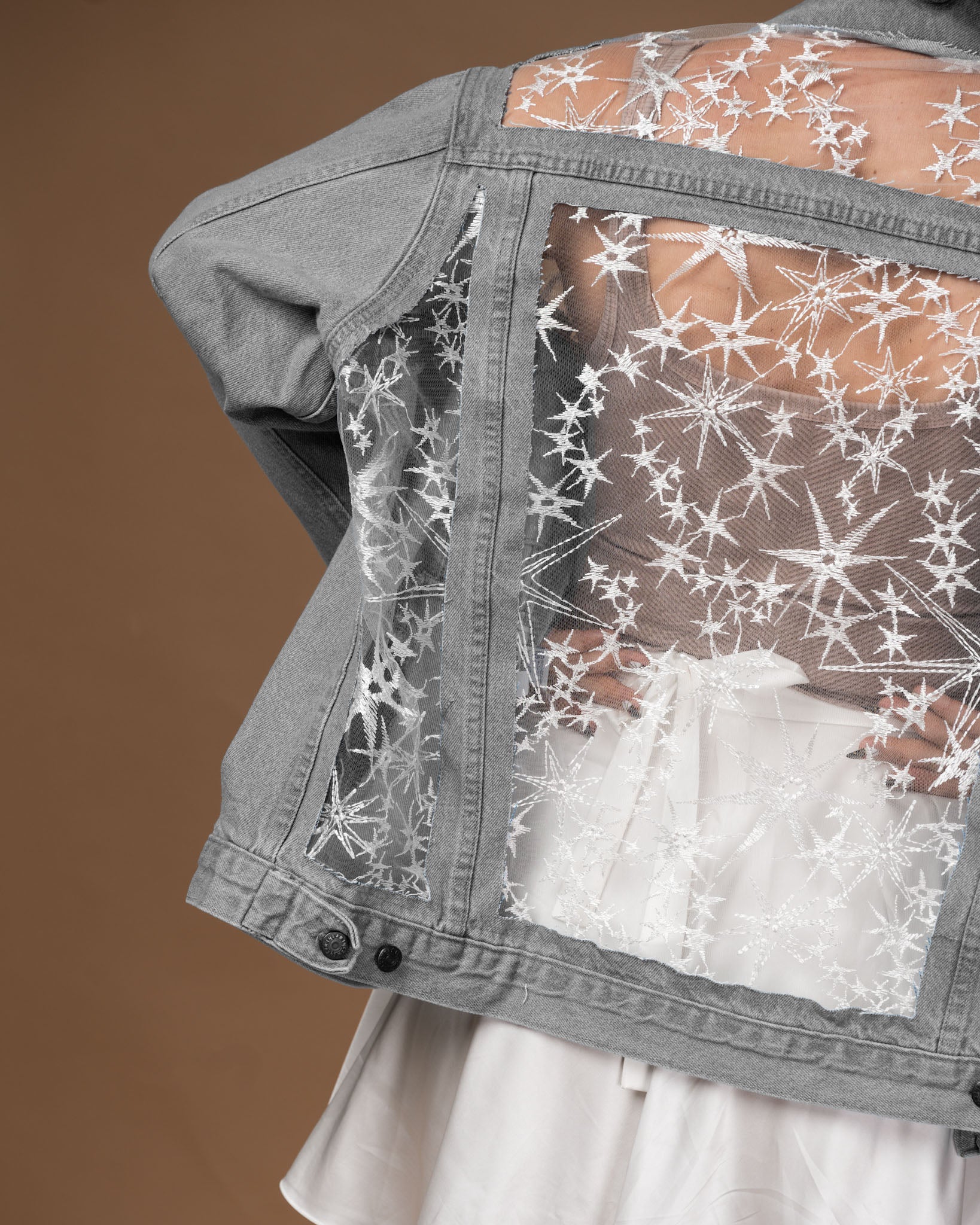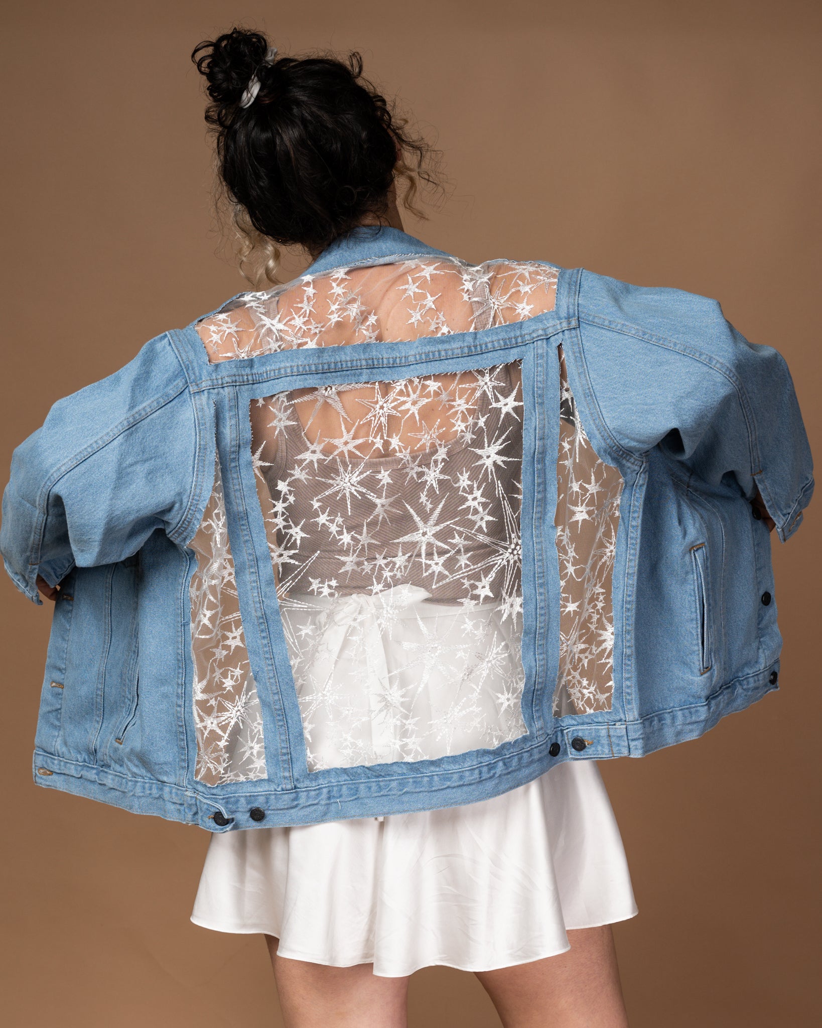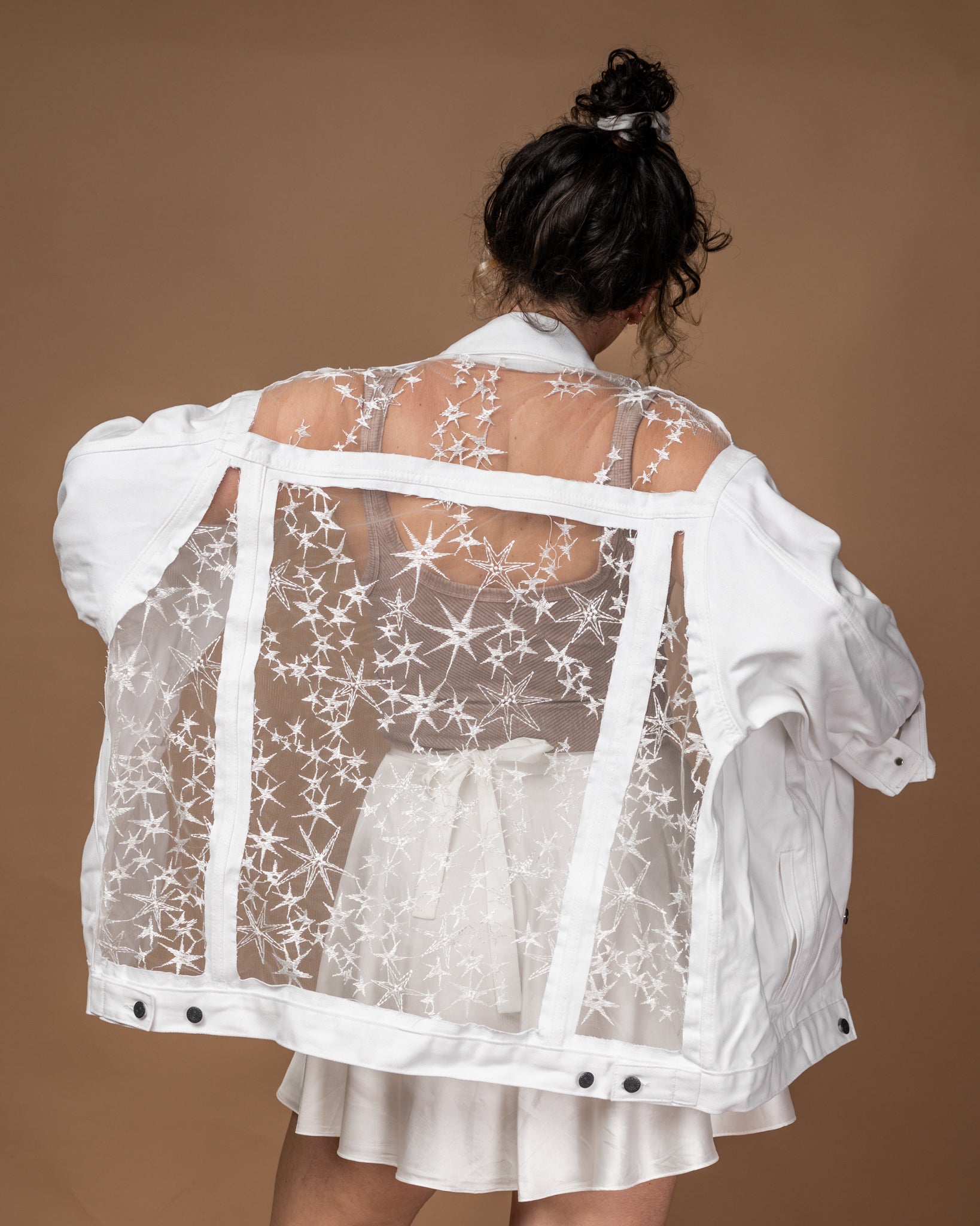 White starry embroidery. White Mesh. White, Black, or Blue Denim.