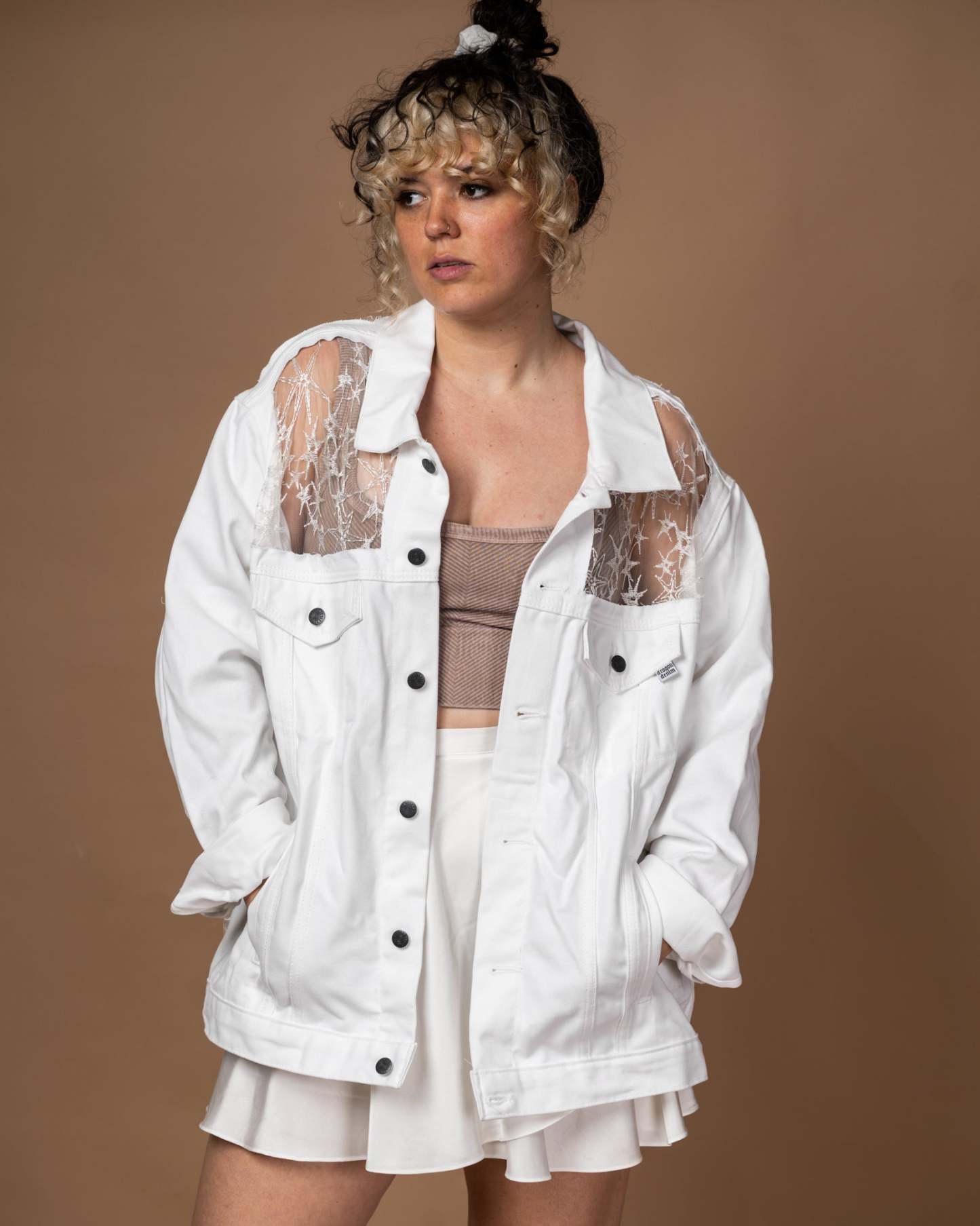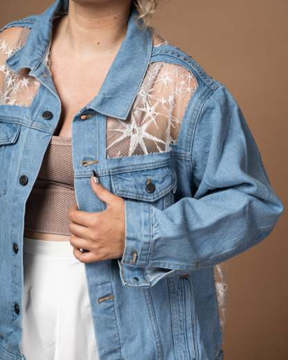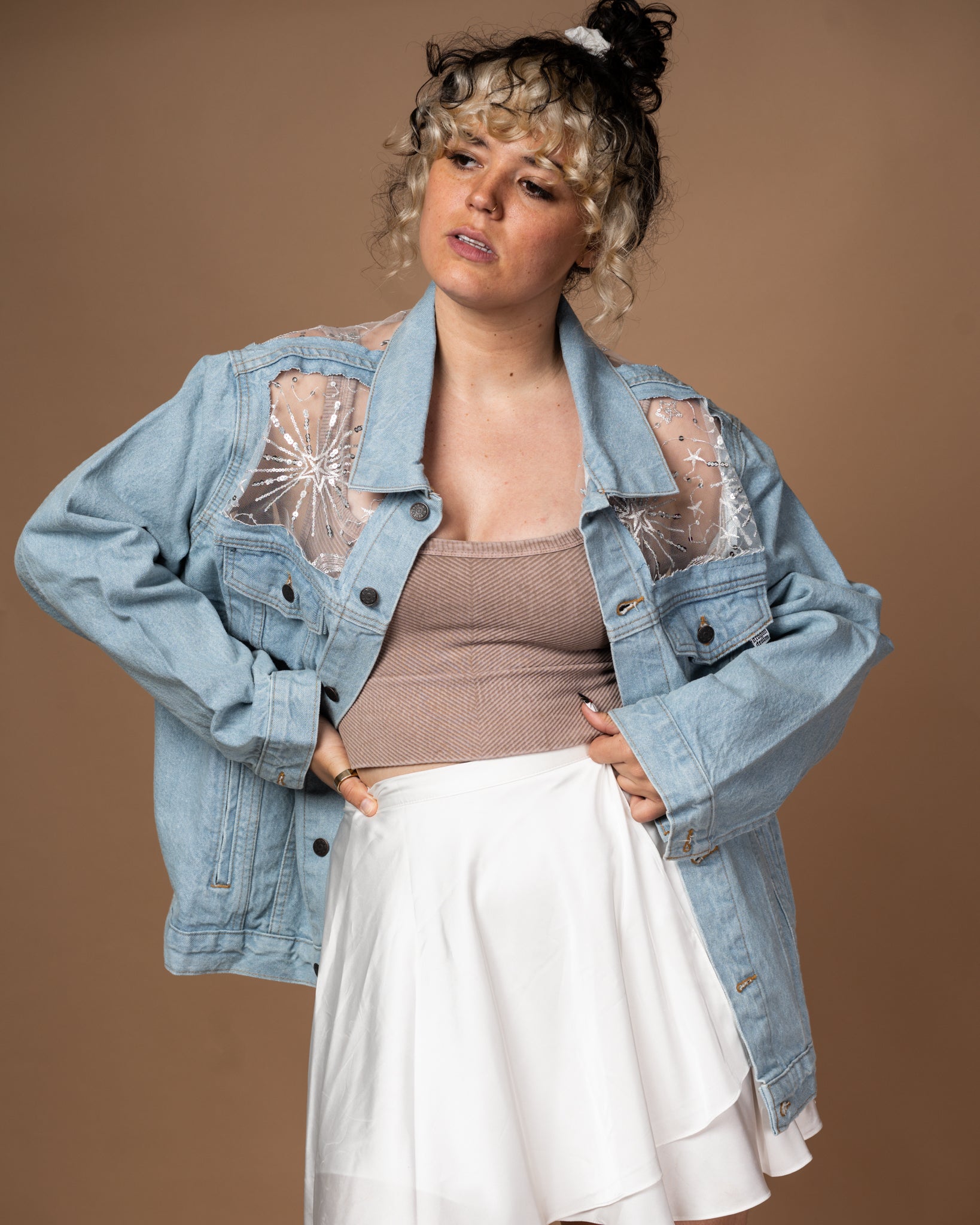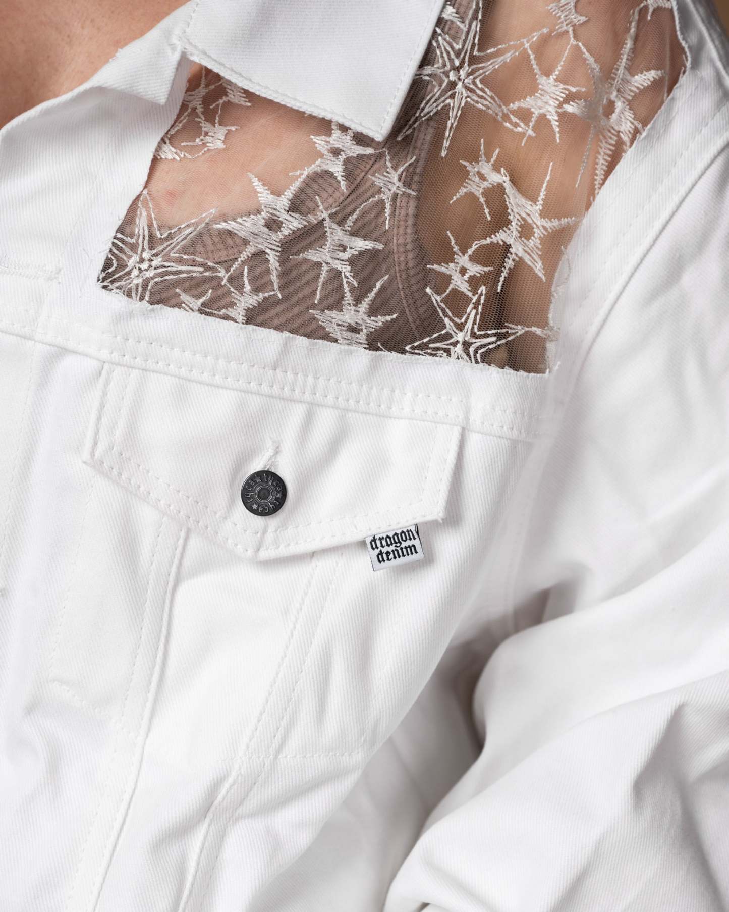 White starry embroidery. White Mesh. White, Black, or Blue Denim.
