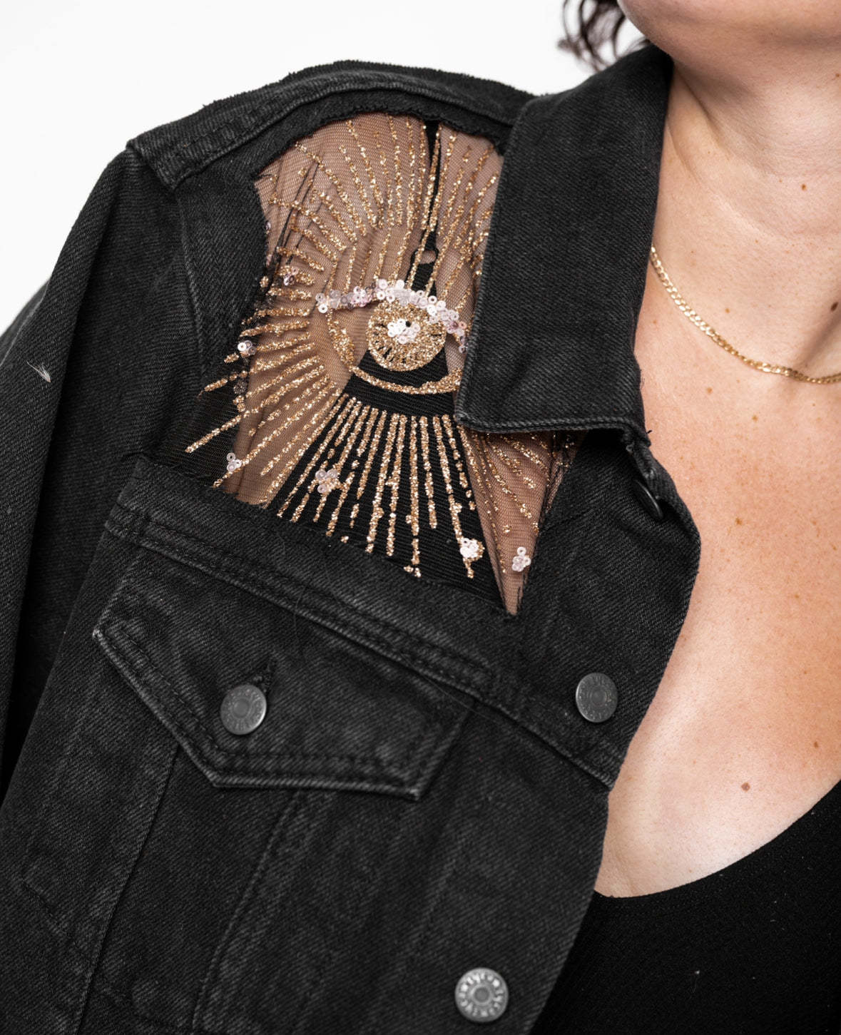 GLITTER eye & celestial motifs. Black Mesh.
