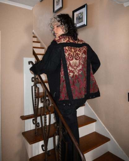 Inspired by old Italian vampire royalty. Deep red embroidery. Tan mesh. Blue or Black Denim.