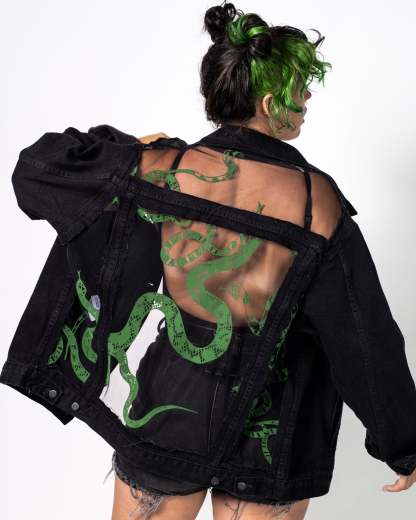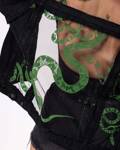 Green Velvet Snakes. Black Mesh. Black Denim.