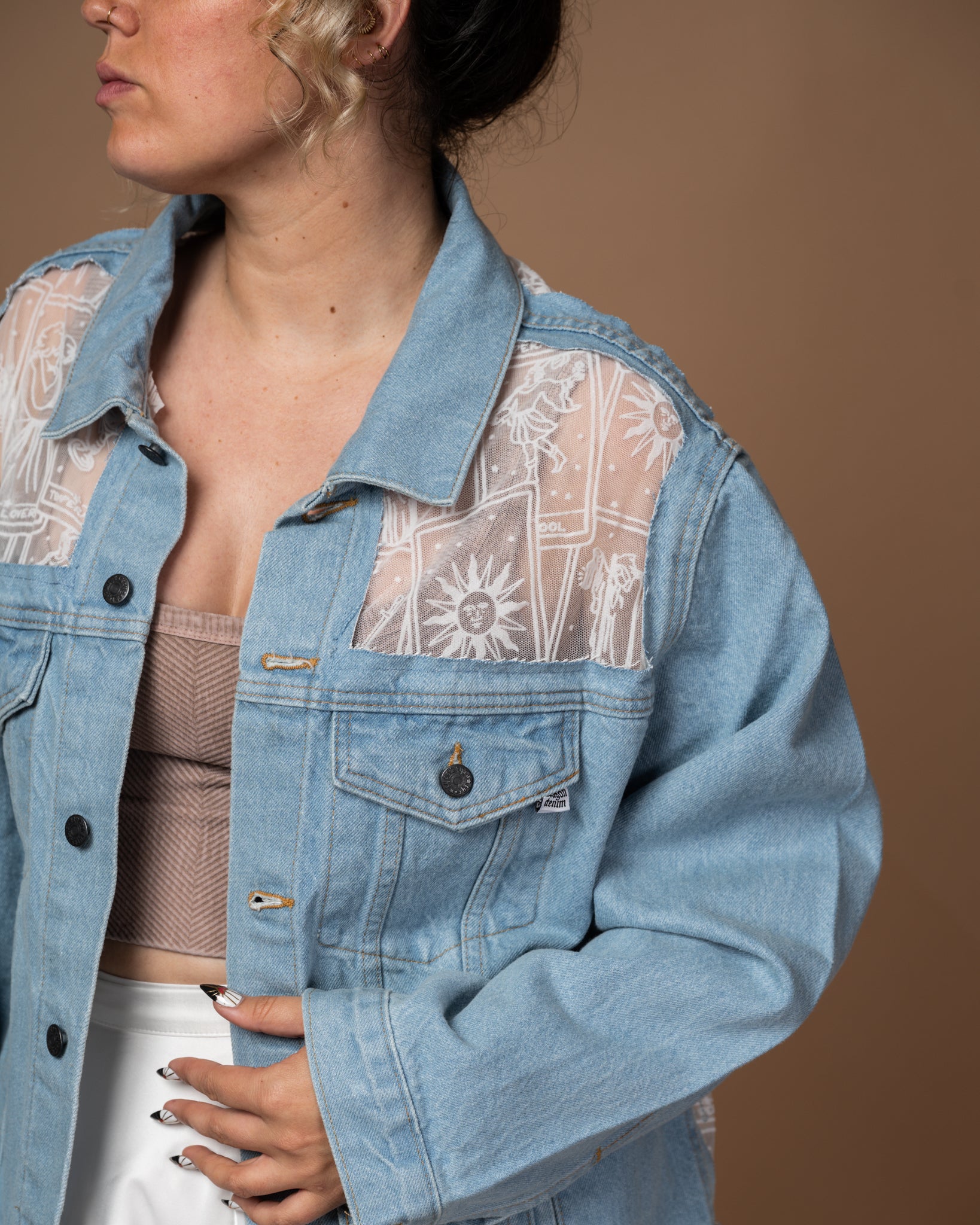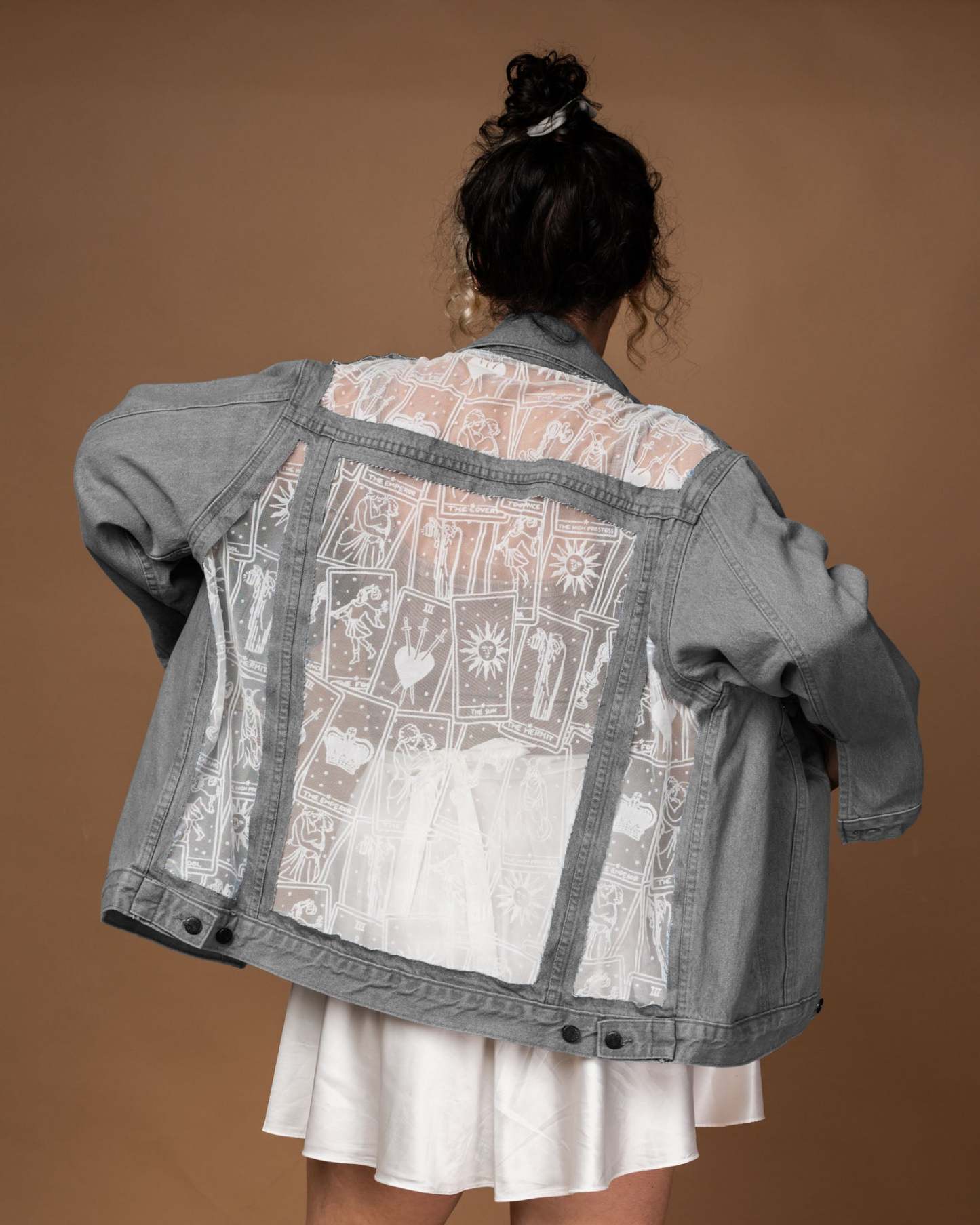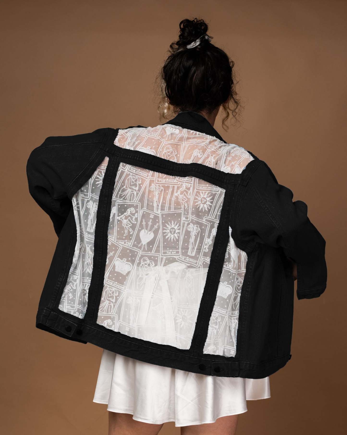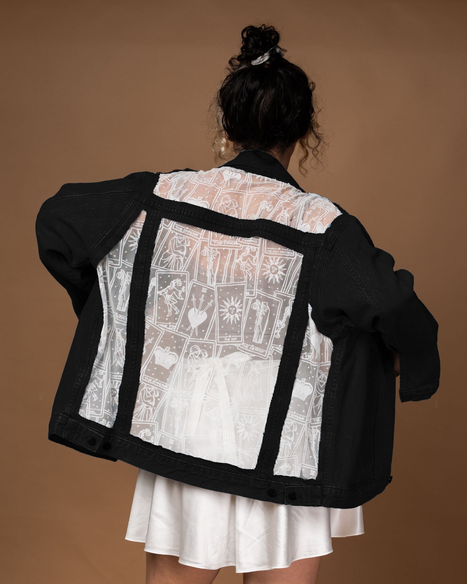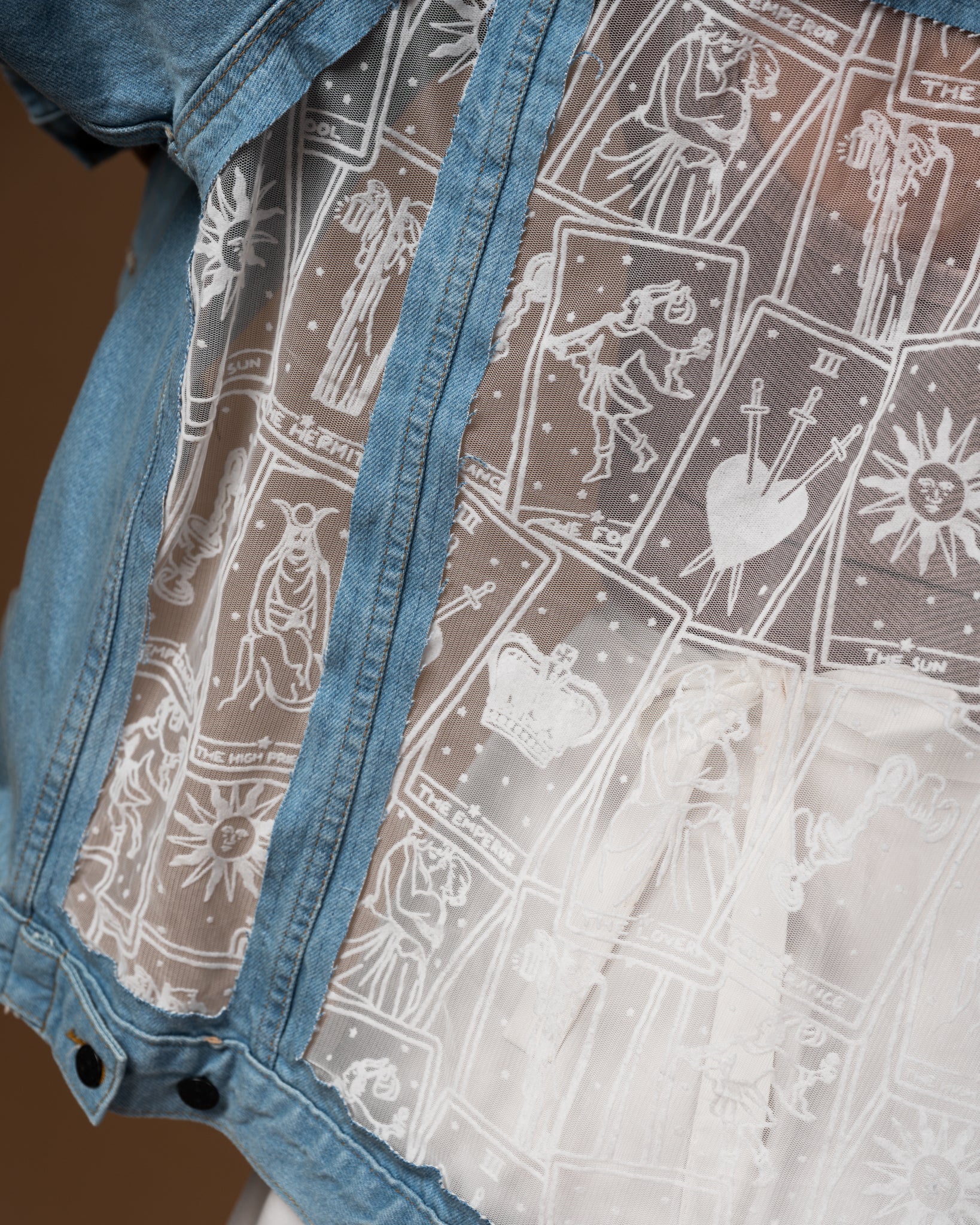 White velvet tarot design. White Mesh. Black, or Blue Denim.