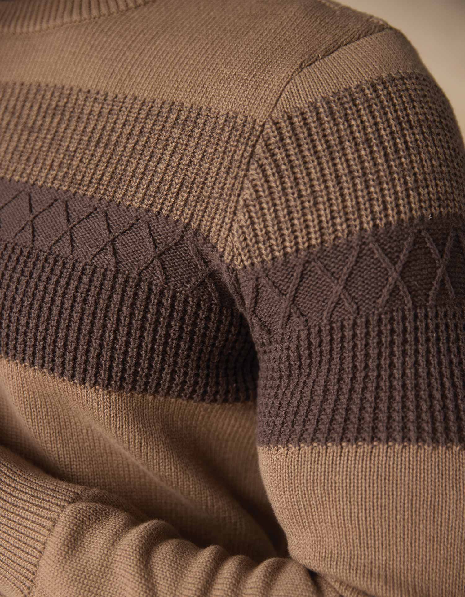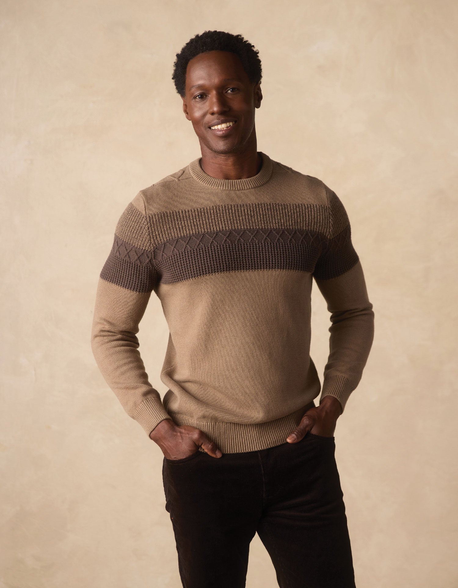 The Tom Stripe Crew is a true-to-size cotton sweater with a soft, classic handfeel and tonal texture that sets it apart. Knit with a jersey stitch base and accented with rib and cable details, it layers in depth with mixed stitch techniques and heathered, twisted yarns for natural color variation and dimension. A timeless staple.
