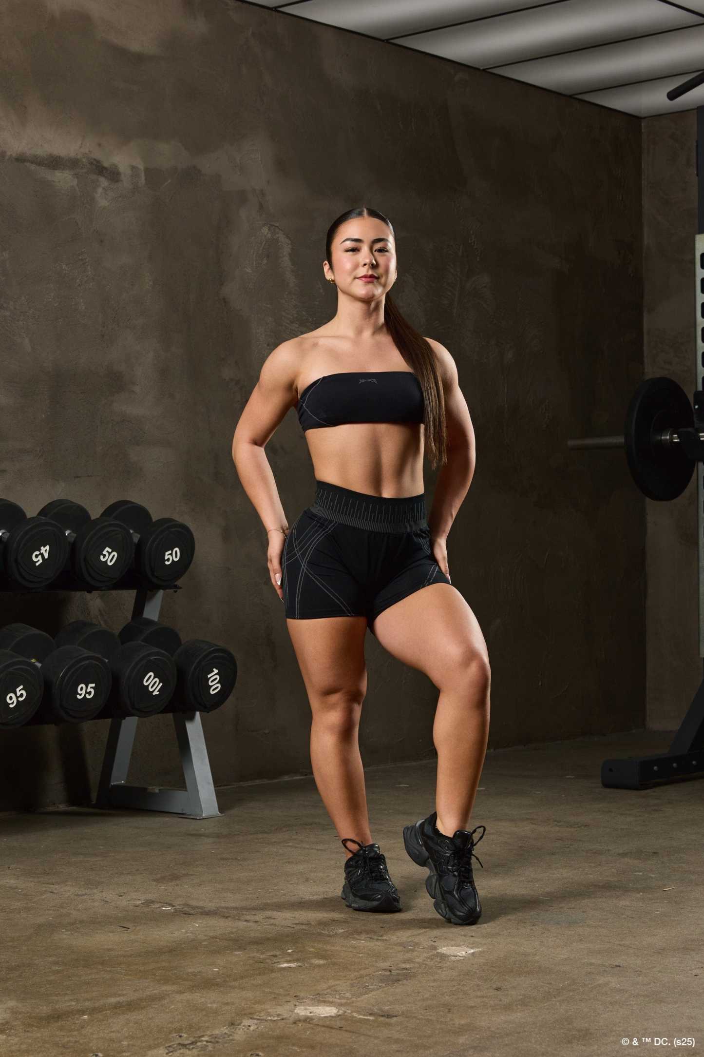 DESIGN: Power your workouts in style with these medium-impact Batman seamless shorts. The mid-rise compressive waistband delivers a flattering, supportive fit, while contrast line detailing and subtle metal logo hits create a sleek, modern look. Comfortable, durable, and iconic, they blend performance function with bold superhero-inspired energy.