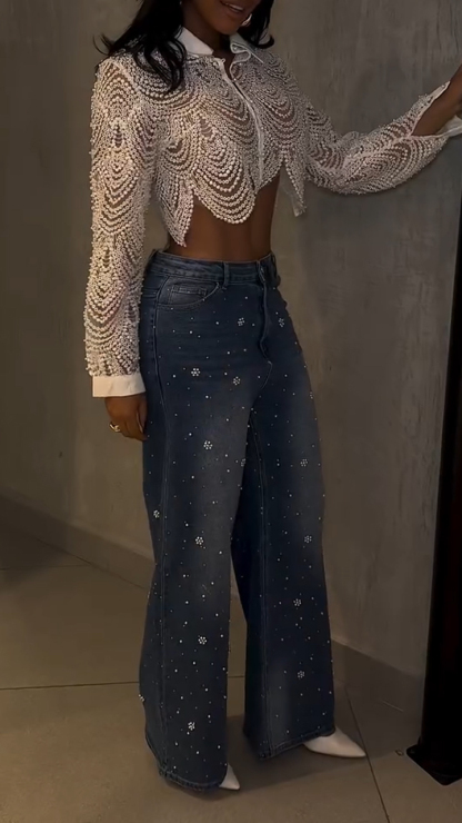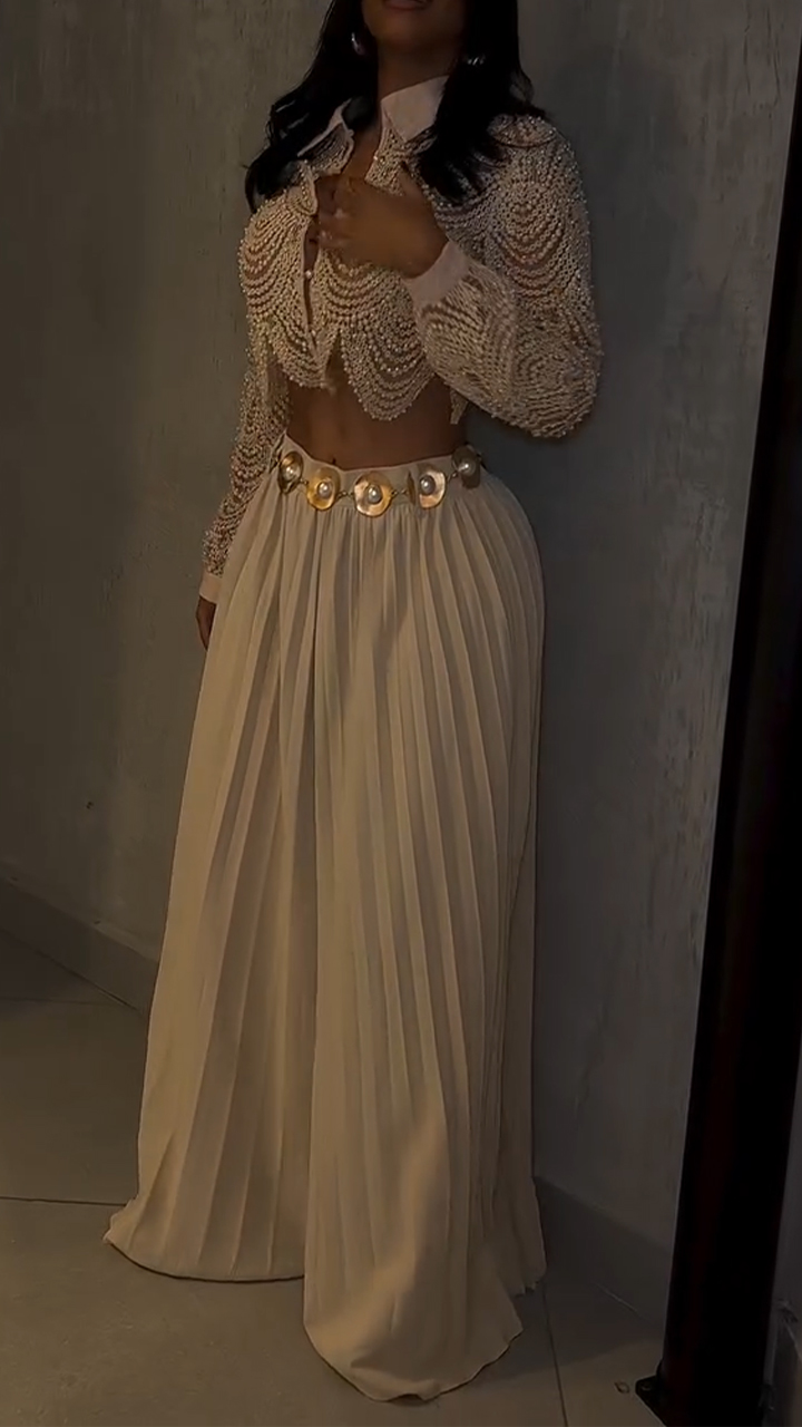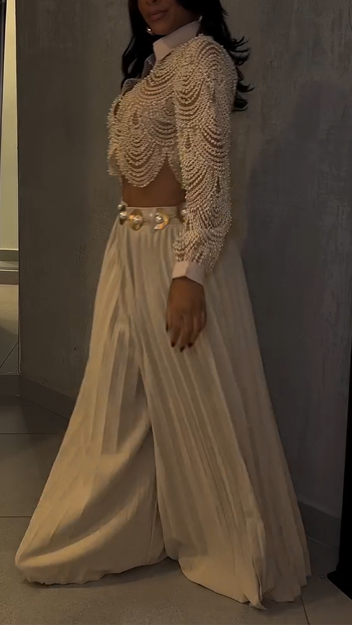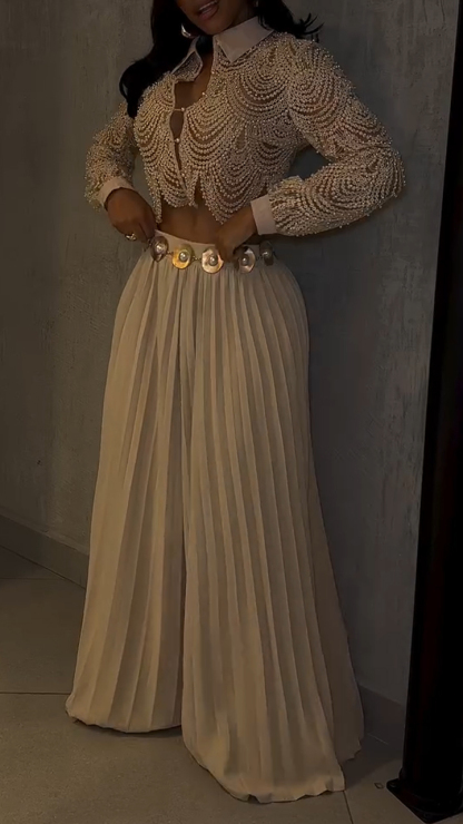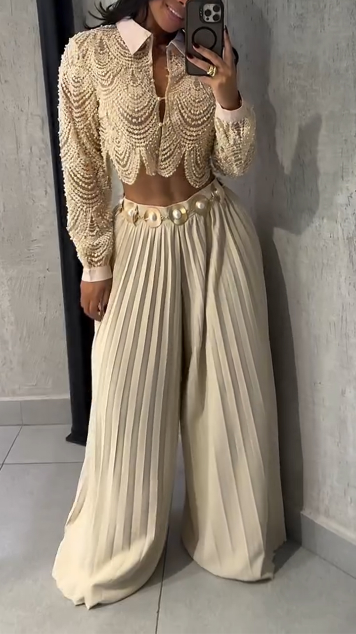 Women Lapel Heavy Industry Top + Pleated Pants Casual Suit
