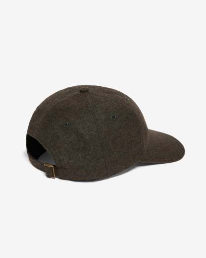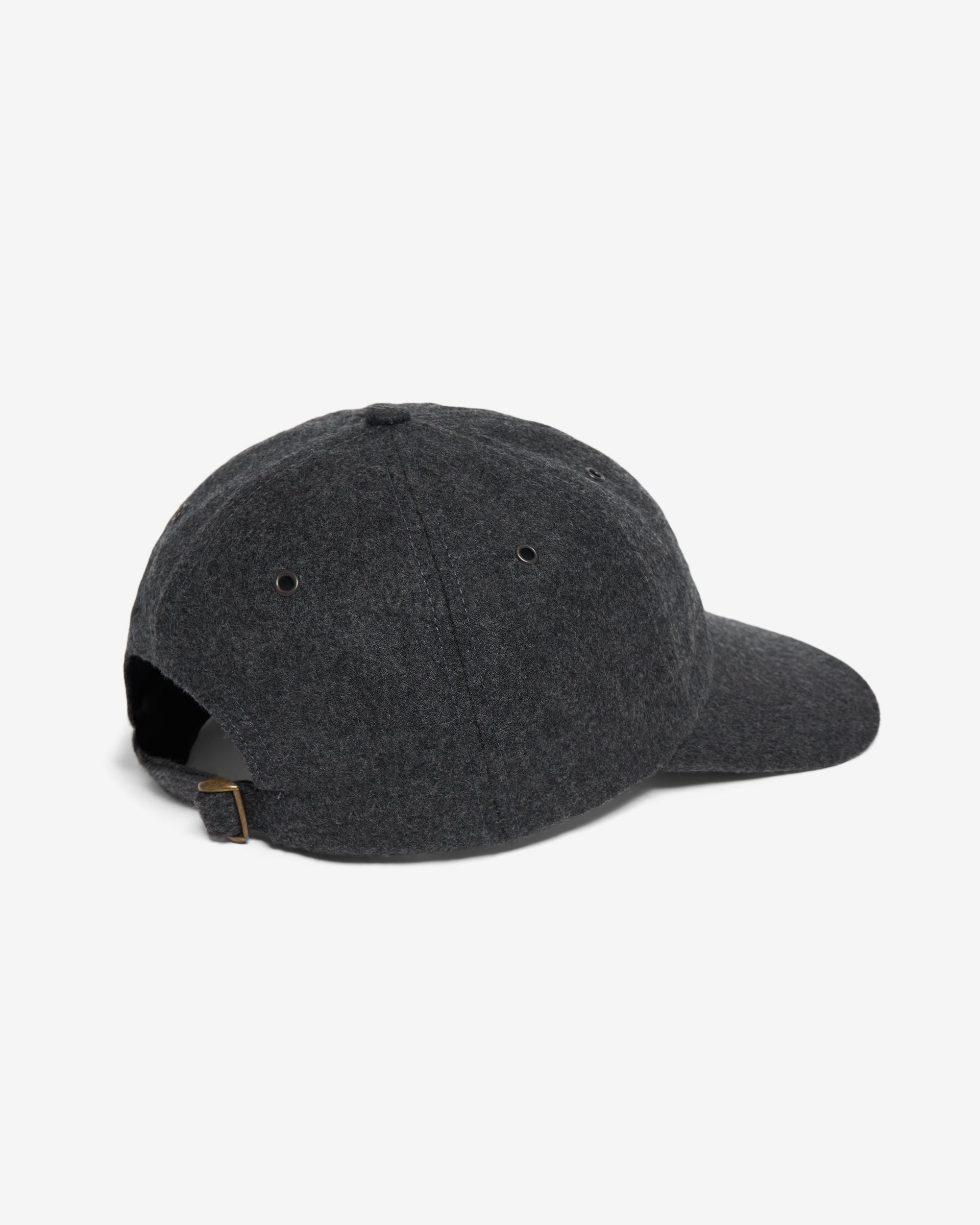 Made in USA. 100% Super 120s wool flannel from England. Painted metal eyelets. Adjustable closure with metal clasp. Embroidered logo on back.