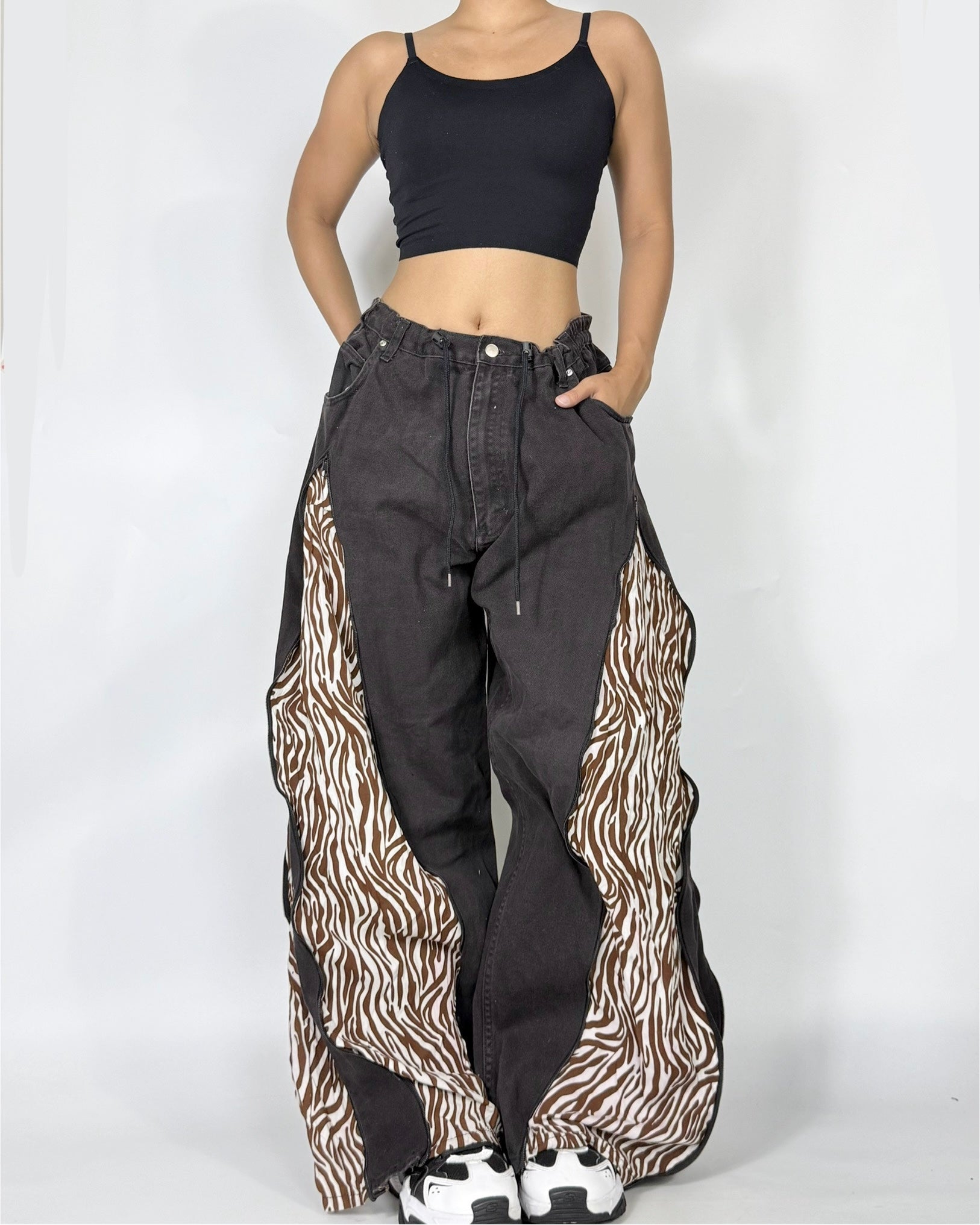 Jeans x Leopard– upcycled from 2 secondhand pairs with adjustable drawstring waist. One of a kind & unisex fit!